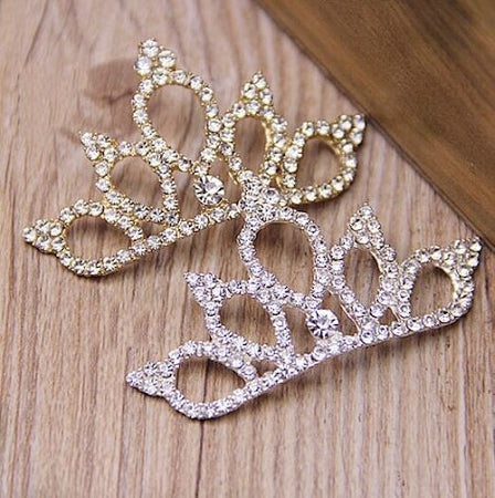 Our crown jewel bow centers are flat back to be glued or sewn into place. Measures 1.25 X 2.25 inches. Sold individually, available in gold or silver tones.