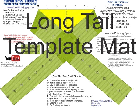 Our new cheer bow series of template mats are amazing! This mat is made from thick mat material with printed common folding template on top. This mat shows how to fold a 2.25" ribbon for softball and collegiate style long tail cheer bows. This folding template shows how to fold bow perfectly proportional and even has ribbon measurement guide printed on the template showing exactly where to place decals and embellishments to make sure they are visible. Printed on the mat are instructions and tips. The mat also doubles as an ironing surface. The mat is thick rubber material with smooth fabric top. You can even brace your ribbon with clips. The mat measures about 15" wide and 12" tall.